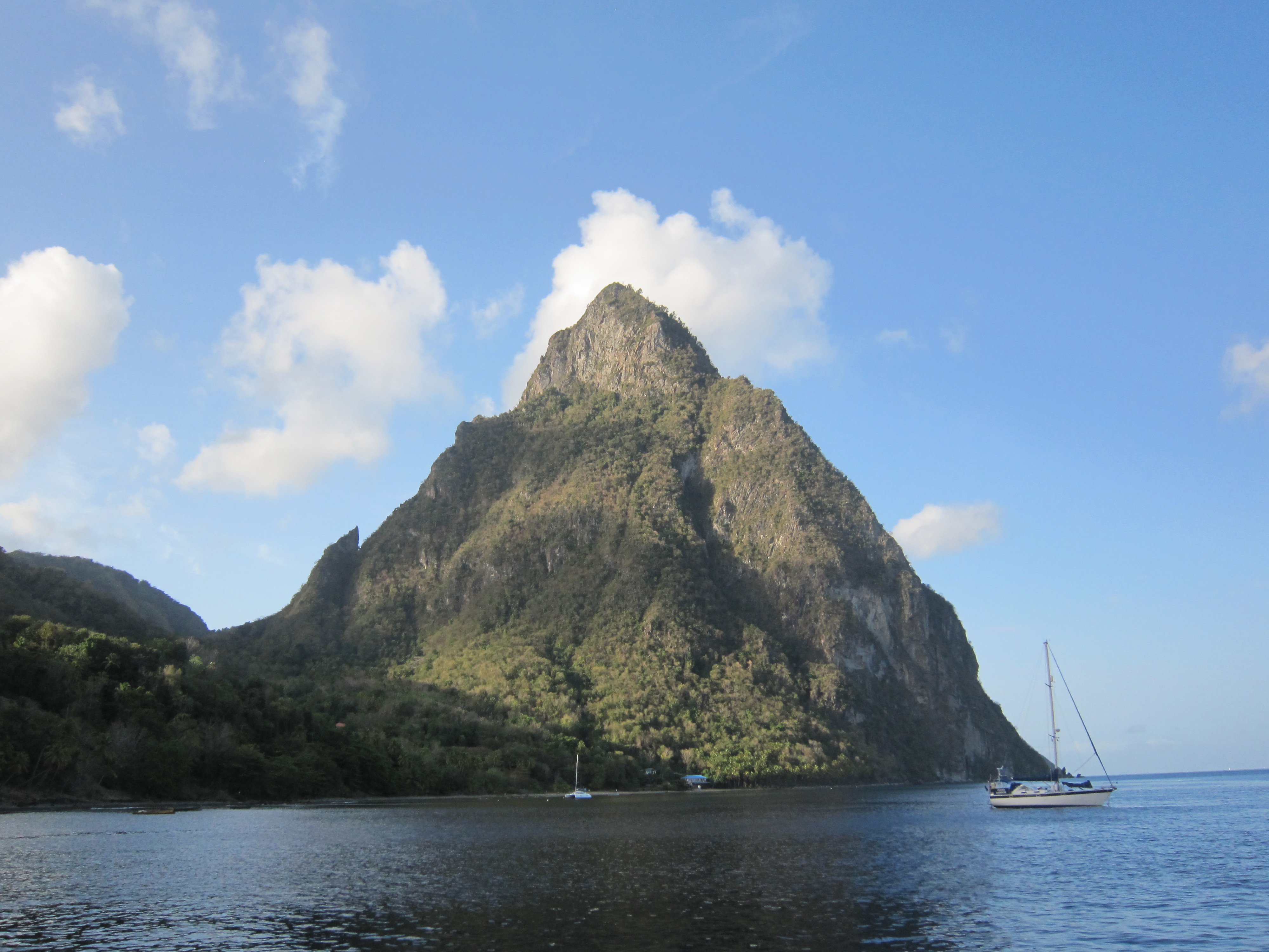 A great night out, setting us just in the mood for a lazy sail down to Soufriere the next morning. I confess to a bit of apprehension here, because the boat boys seem quite pushy. No sooner is the bow pointed into the bay than a pirogue (local wooden boat with a big outboard) is a couple of feet away wanting to take your lines. Unhappy that we want to look around before deciding where to go, he continues to shout dire warnings about the high winds and the difficulty of picking up a mooring. We escaped him, (and his £10/$17/€12 ‘fee’) but shortly after easily picking up a buoy in a sheltered spot, his compatriots start appearing, the best offering fresh fruit, the least convincing are young boys wanting to take your garbage (for a fee, before they throw it behind the nearest rock) or just plain begging. It is off-putting and lends a sense of insecurity about leaving the boat to go ashore.