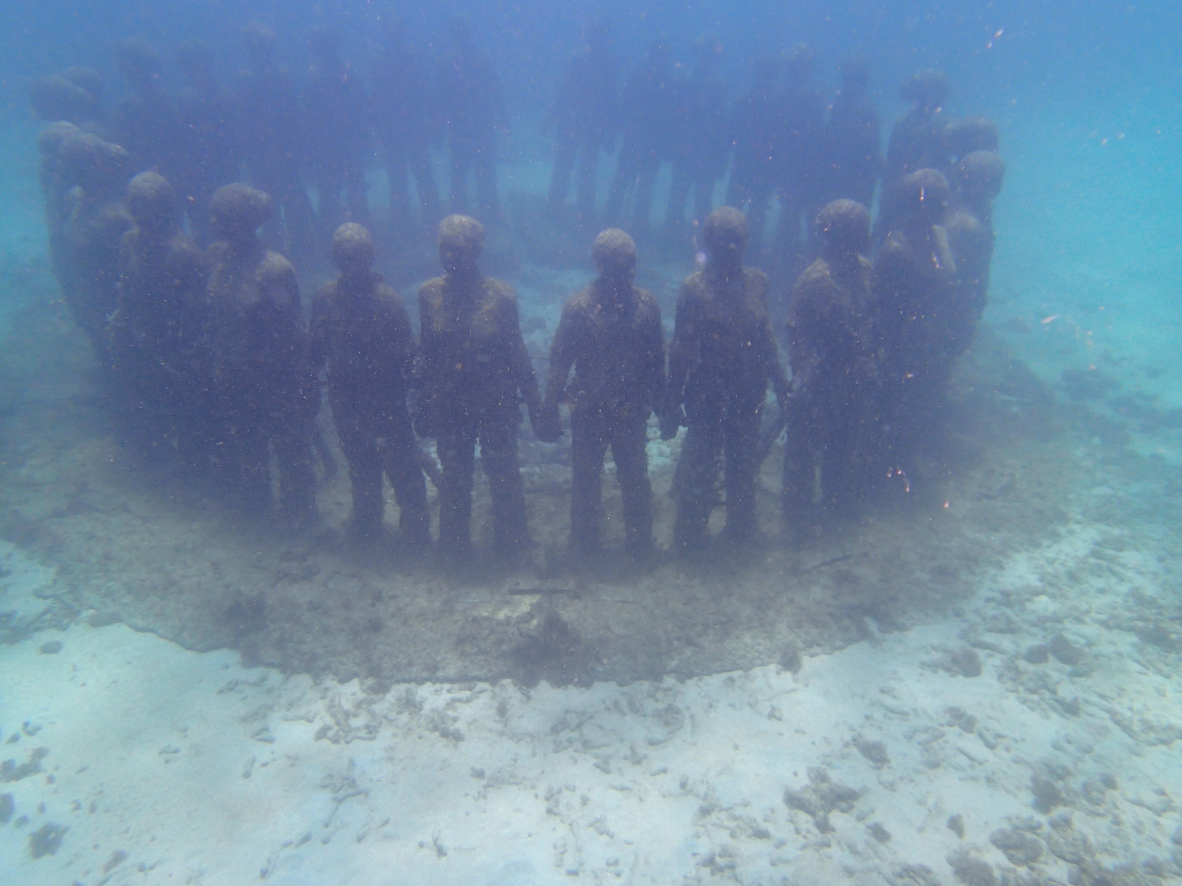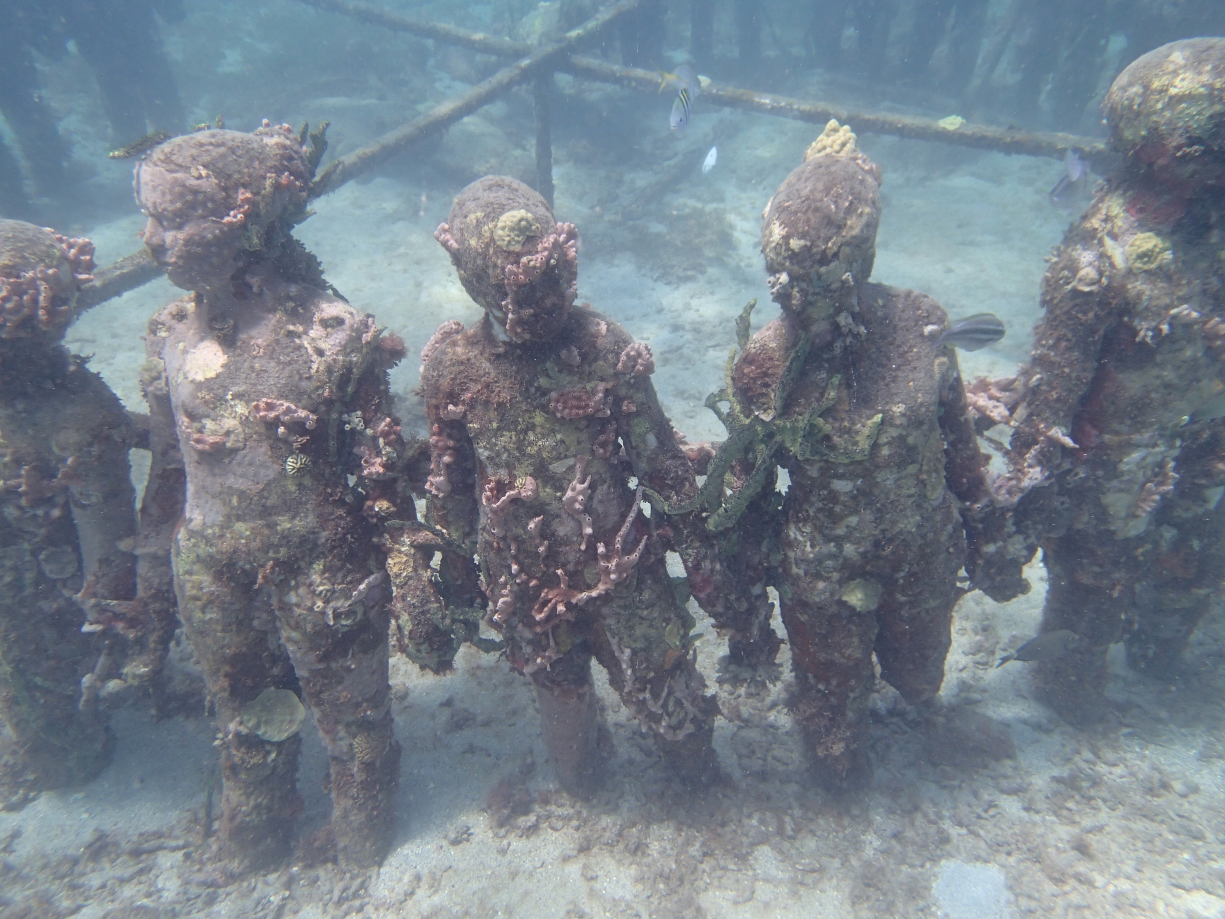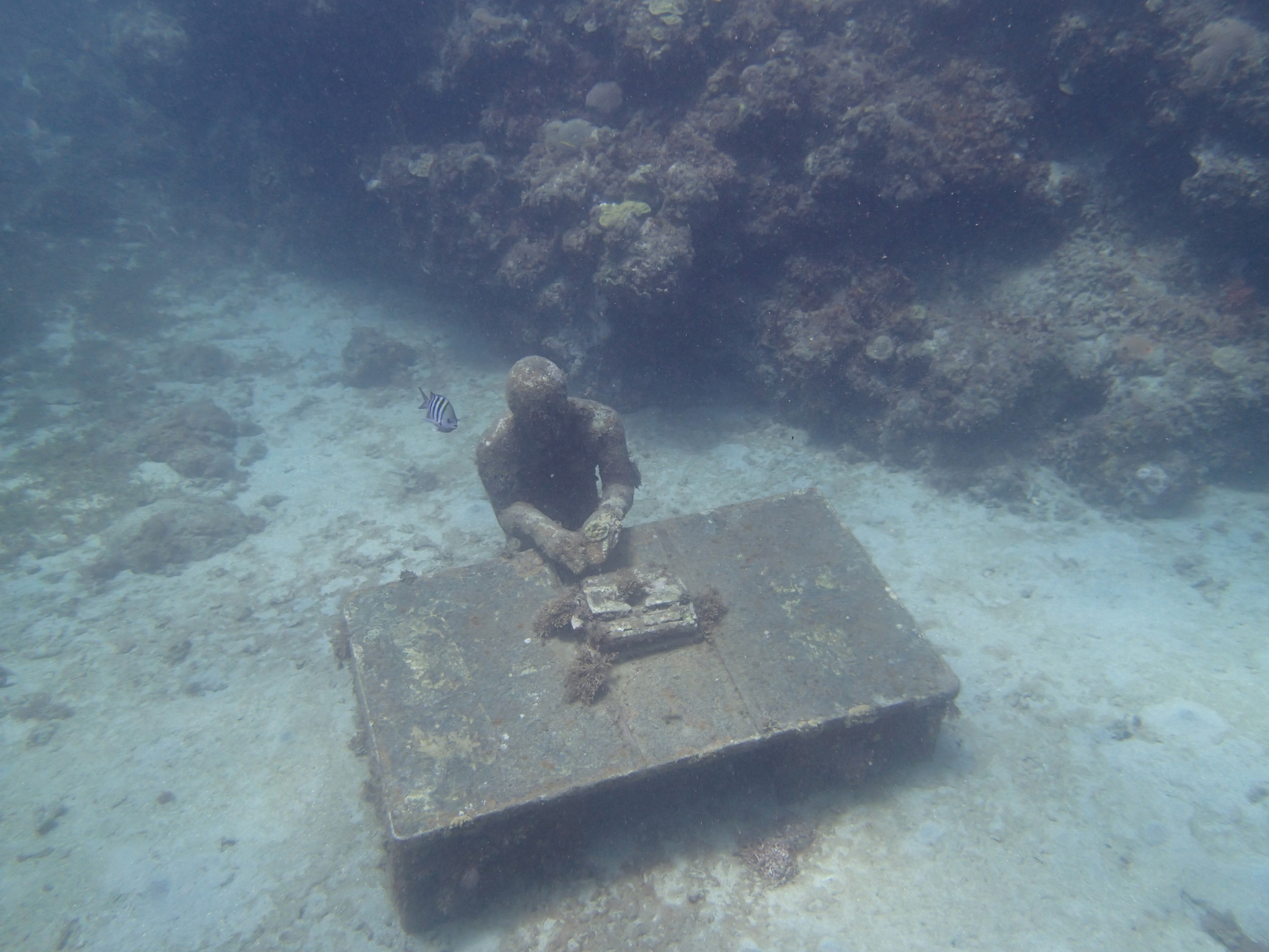 The determination paid off as we found as soon as we jumped over the side, (ok, rolled off backwards). Good visibility and plenty of fish. But the attraction of this particular site is the multitude of sculptures that have placed there. Of the alleged 69, we reckon we saw most. In the midst of our swim, we were approached by a marine ranger boat with a demand for money. Like most people, we do not tend to take money with us when we swim, and so the 3 rangers on board arranged to find us later. Not sure why 3 were need, probably good for local employment, but anyway, they were not seen again.