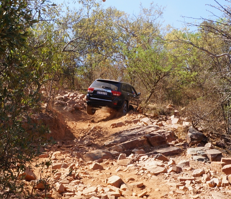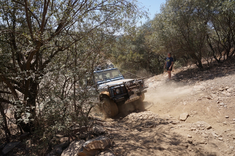 The first km from the gate was pretty innocuous stuff, but then came the first real test. 2 stationary vehicles gave the clue that this might be a bit of a challenge, and so it proved. Personally I would have been reluctant to take a nearly new Discovery 4 on this obstacle, not least because it was a climb through a rock/dust-filled steep gully and then up a step of nearly 1 metre to get out. After a bit of planning, the Disco eased impressively out, followed by the Jeep Wrangler. Big engines, auto transmission and traction control can deliver!