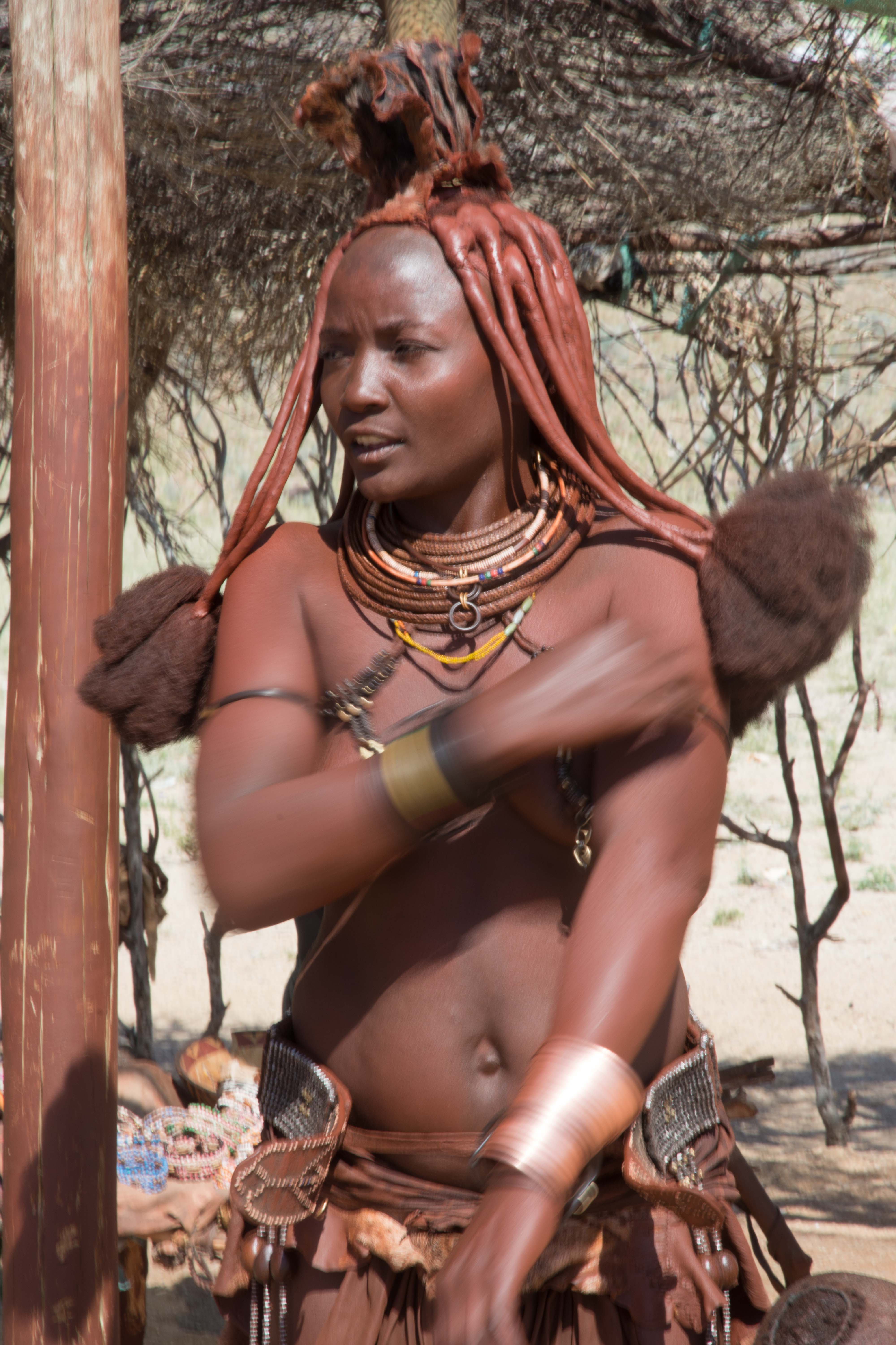 Before anyone gets the wrong idea, Annemarie took this photo! These Herero ladies seek to show the traditional way of living, including grinding the red sandstone rocks to powder and then to paint their bodies and hair. They earn their income from tourists (like Annemarie) and sell the inevitable trinkets.