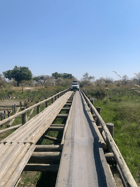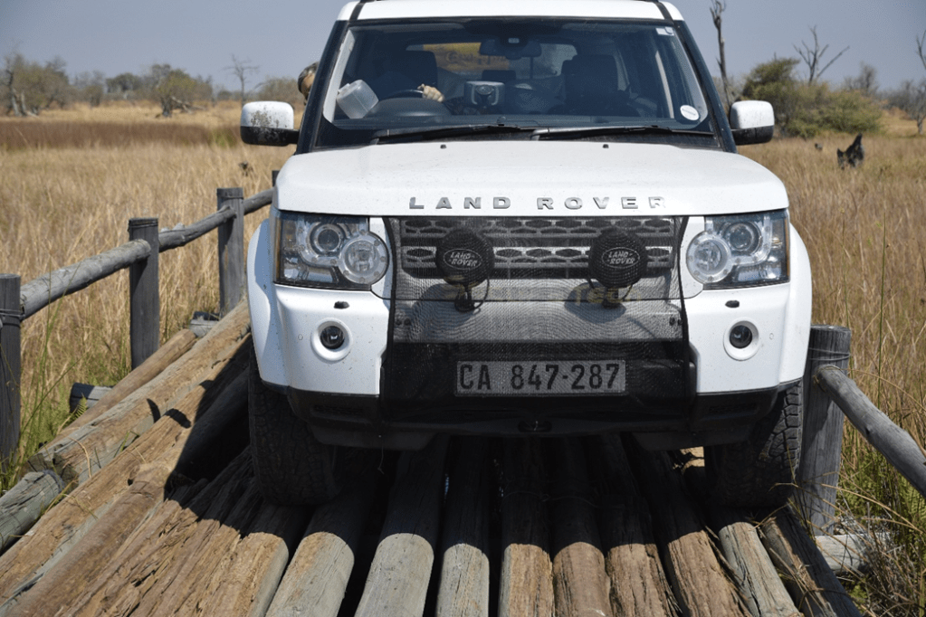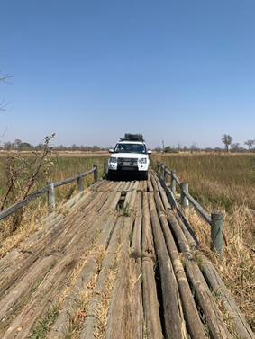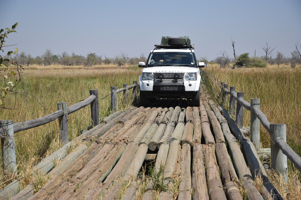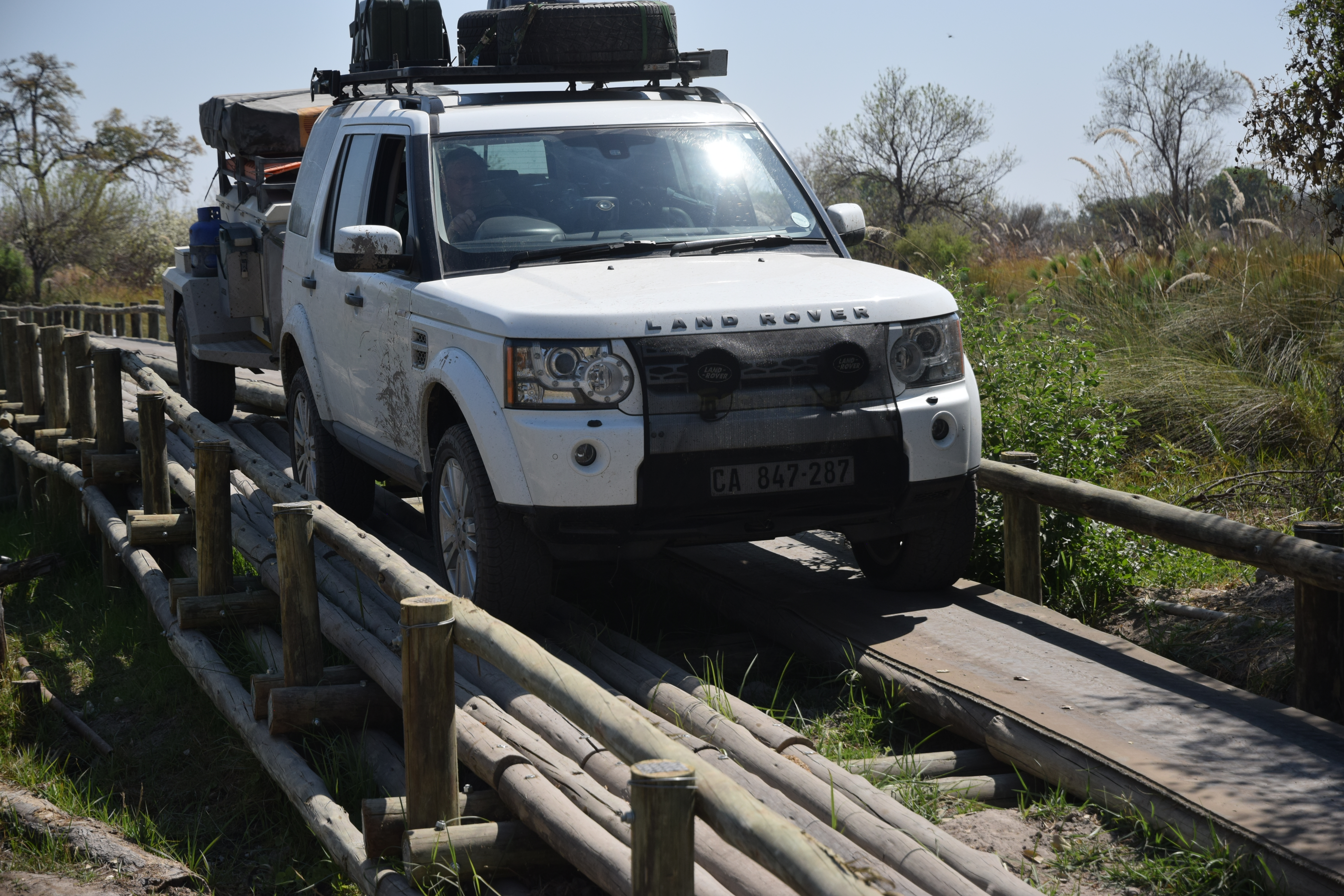 Winding our way round the bush, with almost no sightings, the fourth bridge was in front of us. This was a bit more of a challenge as the bridge was missing a number of timbers, notably where the wheels of the car would normally cross. We walked it first, and then crawled the car and trailer across under guidance, with millimeters to spare. Bear in mind the car weighs over two tons, and the trailer probably about another ton!