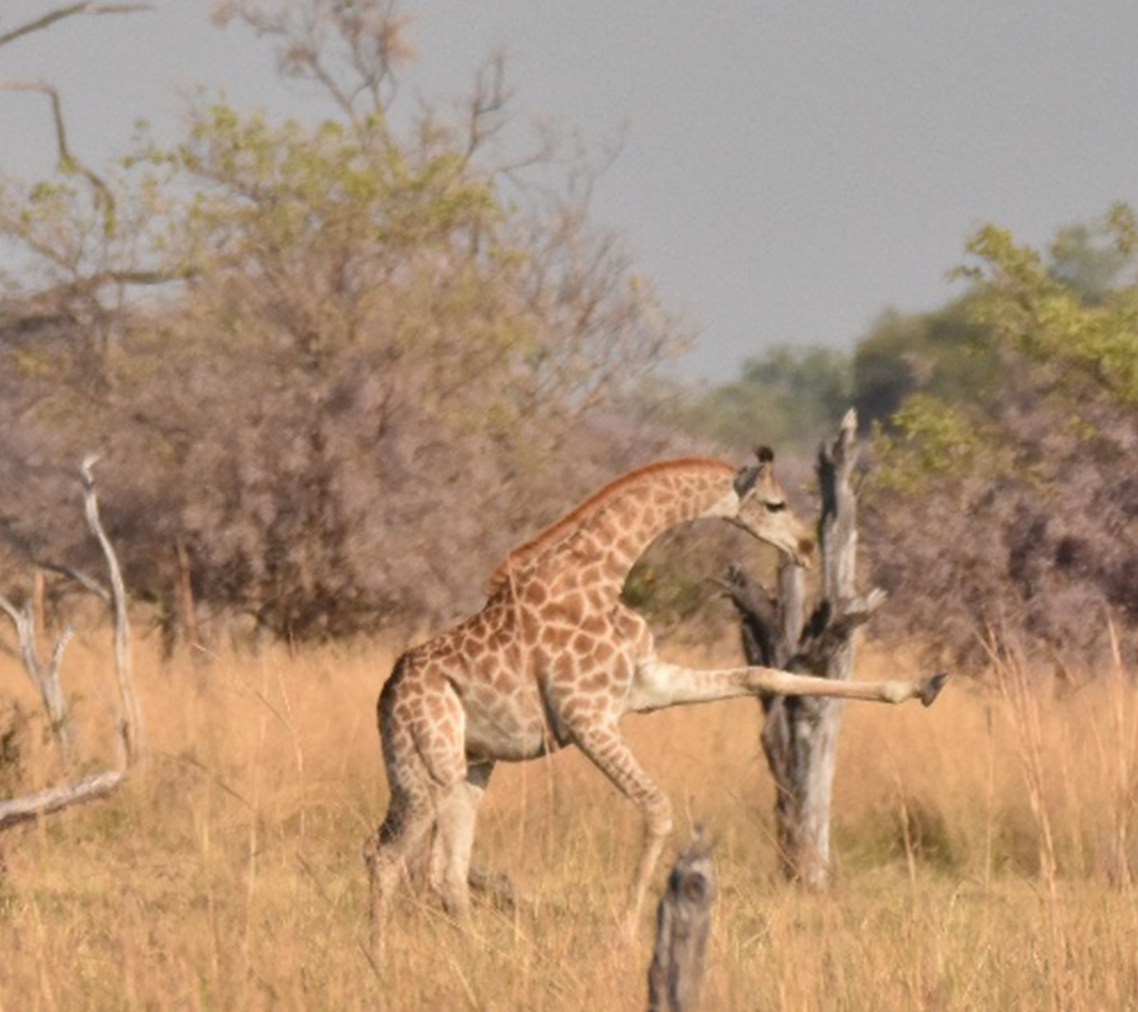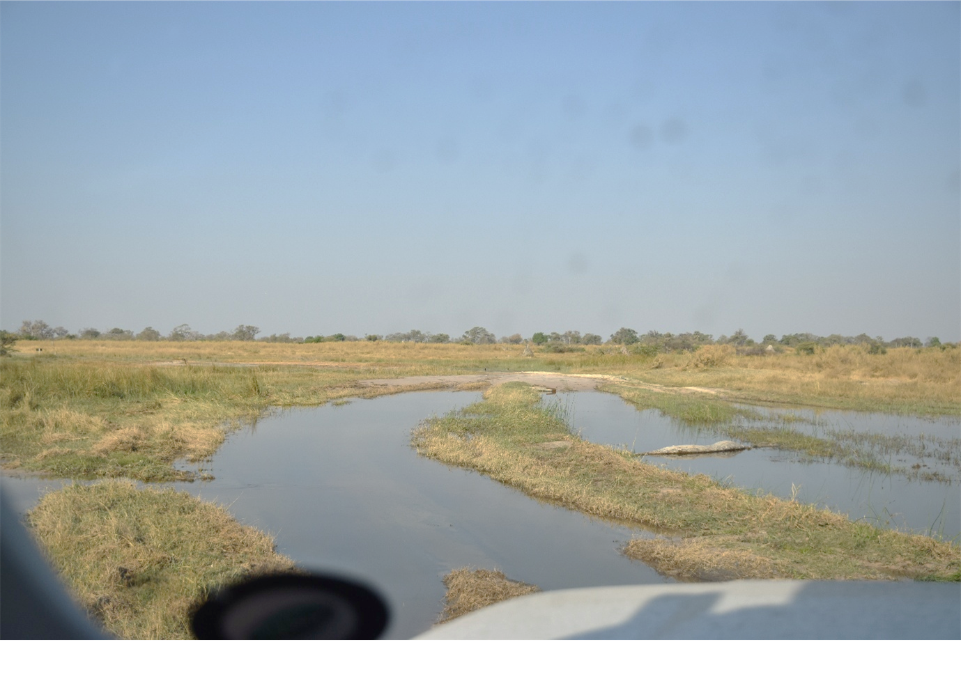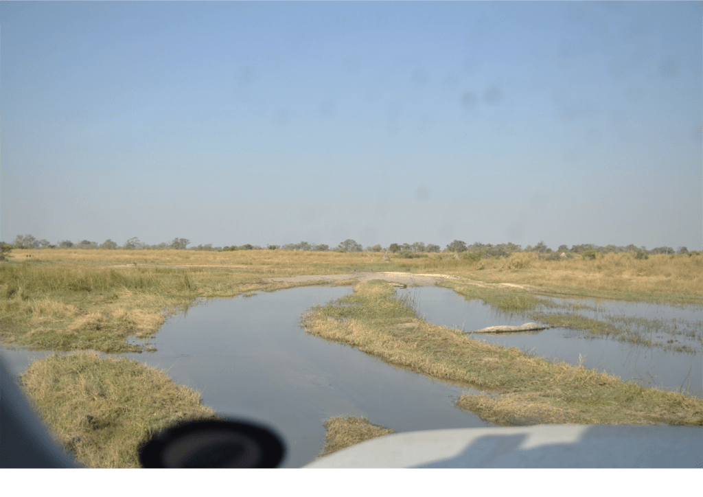 Reaching the Second Bridge again, we opted to drive the diversion. It was a windy track that opened out onto a plain with waterholes, beside one of which lay the skeletal remains of a giraffe with an ‘honour guard’ of two others standing close by. The slight catch with the ‘diversion’ was having to cross a patch of water, followed by a patch of deep mud. It was certainly a sigh of relief when we got through, with a car coated in mud/whatever! No chance with a heavy trailer on the back.