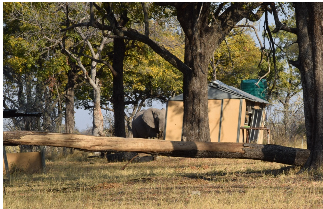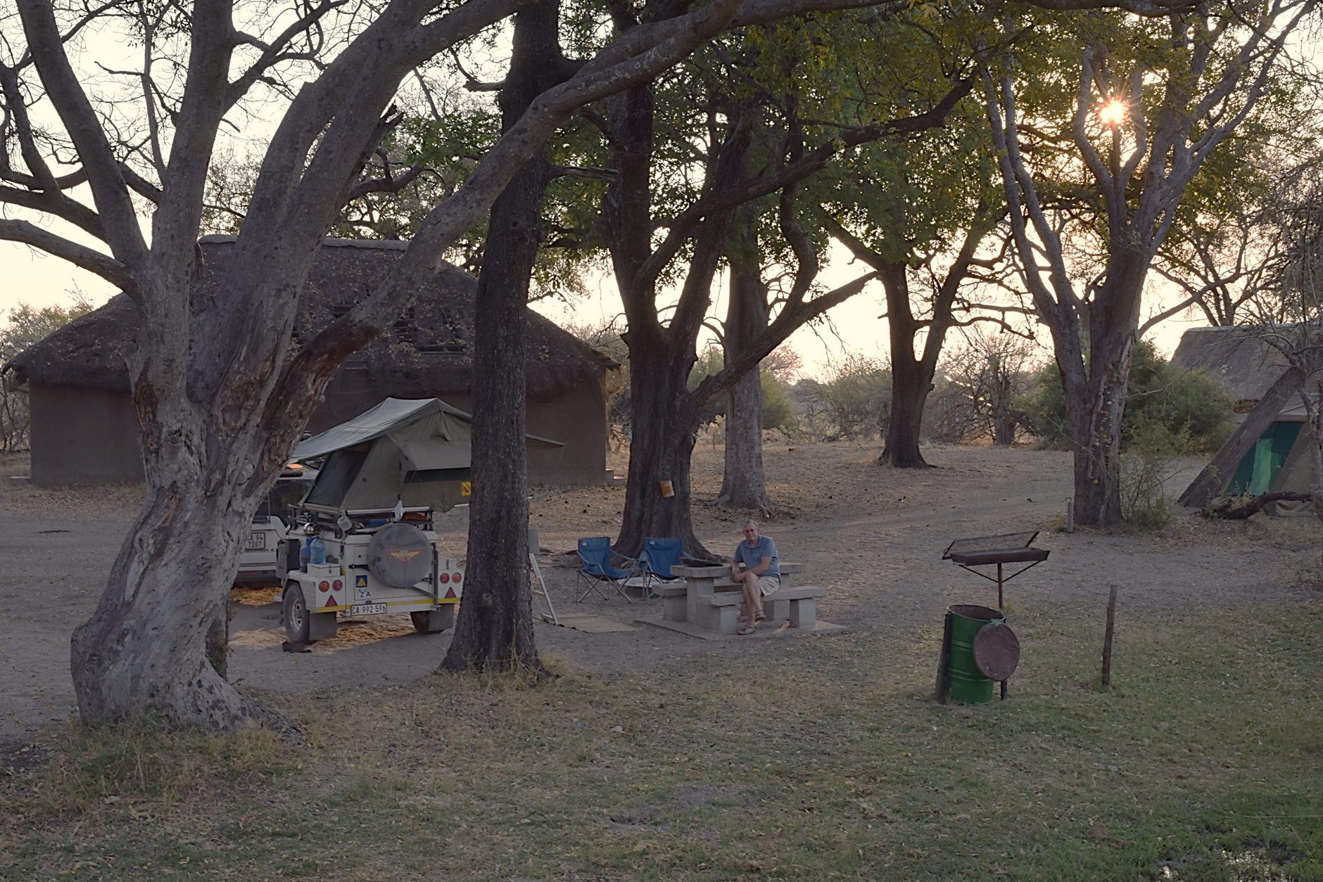 Arriving at the next camp office, we were directed to our camp, some kilometers up the track. We were taken aback by the very dilapidated and neglected site, but just accepted that this is Africa and set up the tent, etc. Shortly after, a curious elephant appears at close quarters. We creep around the car keeping it between us and our big grey companion! He got bored and moved off, only for a group of staff in a pick-up to appear and tell us we were at the wrong site! Time to pack up again and then follow them about another 5kms along the track to a rather better camp site!
